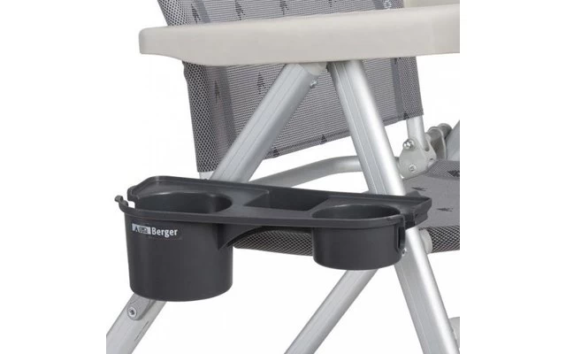 Unser Berger Getränkehalter aus stabilem Kunststoff hat 2 Fächer (Ø 10 cm und Ø 8 cm) und kann an jedem Klappsessel fixiert werden.
