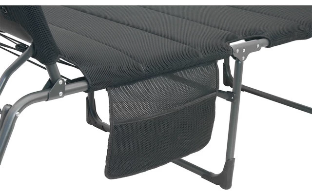 Hohe und breite Aluminiuim Dreibeinliege die ein bequemes Platznehmen und aufstehen verspricht. mit einem 3-schichtig gepolsterter 3D-Stoff, welcher weich und atmungsaktiv ist. Durch die offene Gewebestruktur verbleibt keine Feuchtigkeit in diesem hochwertig gepolsterten Stoff. Mit einem Kissen und 4-fach verstellbarer Rückenlehne für maximale Entspannung. Gestell mit anthrazitfarbener Epoxy-Beschichtung. Inklusive praktischer Seitentasche für Strandaccessoires. Die Liege kann sehr flach zusammengeklappt werden, und ist mit den Tragegriffen leicht zu tragen.
