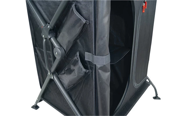 Der Küchenschrank von Crespo ist sehr stabil und robust. Er ist sehr einfach zu öffnen dank seines exklusiven Faltsystems! Dieser Küchenschrank mit Stauraum ist mit einer Oberseite aus HPL (Hochdrucklaminat) Farbe Grijs ausgestattet, die gegen hohe Temperaturen und Feuchtigkeit beständig ist. Die Struktur besteht aus Epoxidharz und lackiertem Aluminium. Die Abdeckung besteht aus super widerstandsfähigem 600D Polyester und beherbergt praktische Regale im Inneren. Die Beine können individuell eingestellt werden und verfügen über selbstnivellierende Zähler, um absolute Stabilität auf jeder Oberfläche zu gewährleisten. Eine Tragetasche und Vorhängeschloss sind inklusive.