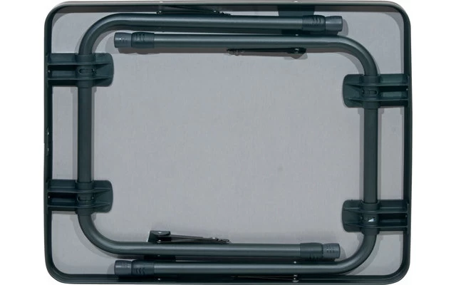 Aluminium-Campingtisch mit epoxy-beschichtetem Gestell und Aluminiumumrandung.